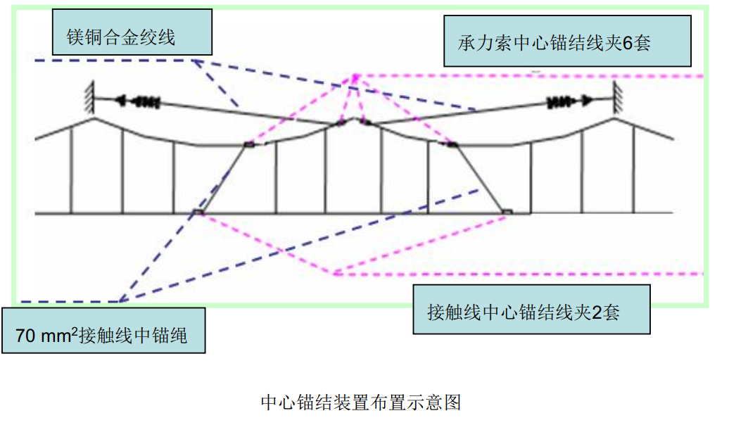 中心锚结装置用于接触悬挂系统中防止整个锚段向一侧窜动或者接触悬挂断线时缩小事故范围。